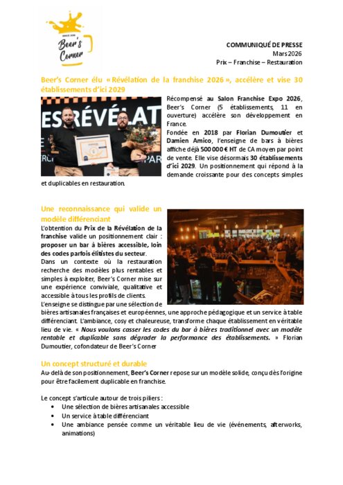 Elu « Révélation franchise 2026 », Beer’s Corner vise 30 établissements d’ici 2029