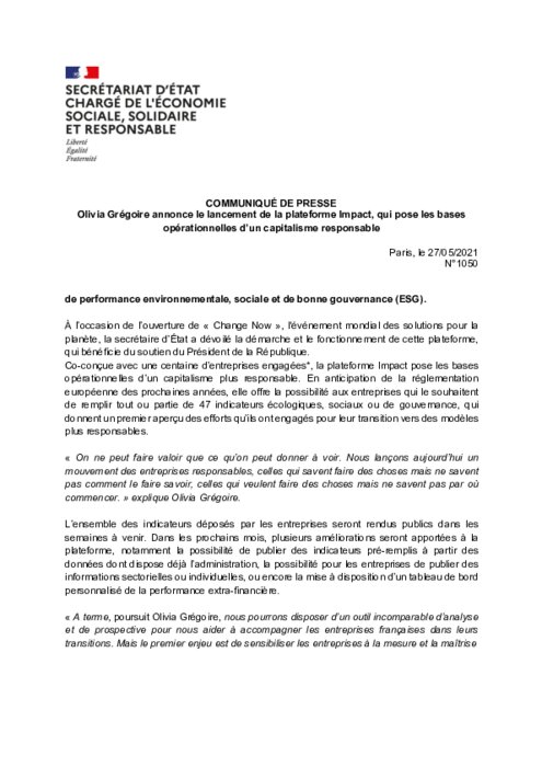 Olivia Grégoire, secrétaire d’État auprès du ministre de l’Économie, des Finances et de la Relance chargée de l’Economie sociale, solidaire et responsable, lance aujourd’hui la plateforme Impact, qui permettra à toutes les entreprises volontaires, de la TPE au CAC 40, de publier leurs données de performance environnementale, sociale et de bonne gouvernance (ESG).