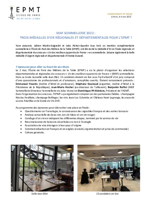 Yann Amarant, Adrien Martin-Guignolet et Jules Pichon-Quantin tous trois en mention complémentaire sommellerie à l’École de Paris des Métiers de la Table (EPMT), ont décroché la médaille d’Or en finale régionale et départementale du concours « Un des meilleurs apprentis de France » en sommellerie.