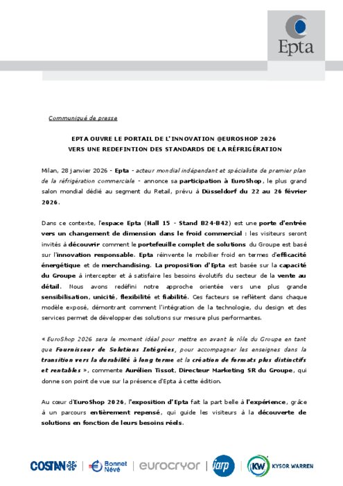 Lors d’EuroShop 2026, Epta tiendra une conférence de presse dans la Talking Epta Arena pour dévoiler des solutions innovantes dédiées à une réfrigération plus durable et plus efficace pour améliorer l'expérience d'achat. Au cours de cet événement exclusif, les Top Managers du Groupe illustreront la vision stratégique sur l'avenir du secteur du Retail, approfondiront les tendances et les nouveaux concepts, et offriront une occasion unique de découvrir de près la stratégie d'entreprise d'Epta.