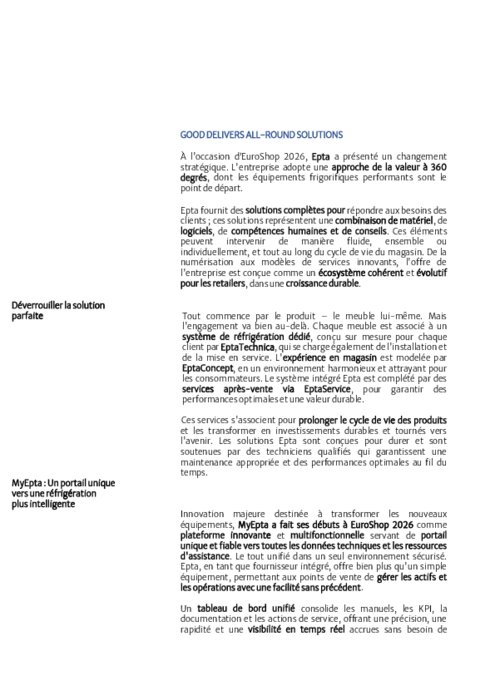 À l'occasion d’EuroShop 2026, Epta a présenté un changement stratégique. L'entreprise adopte une approche de la valeur à 360 degrés, dont les équipements frigorifiques performants sont le point de départ. Epta fournit des solutions complètes pour répondre aux besoins des clients: de la numérisation aux modèles de services innovants, l'offre de l'entreprise est conçue comme un écosystème cohérent et évolutif pour les retailers, dans une croissance durable.