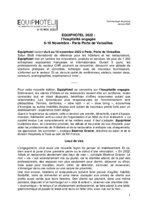 Métiers 18 janvier 2022 - 10:50 Le salon BtoB international de référence pour les hôteliers et les restaurateurs se tiendra du 6 au 10 novembre 2022 à Porte de Versailles. PDF (196 Ko) Télécharger