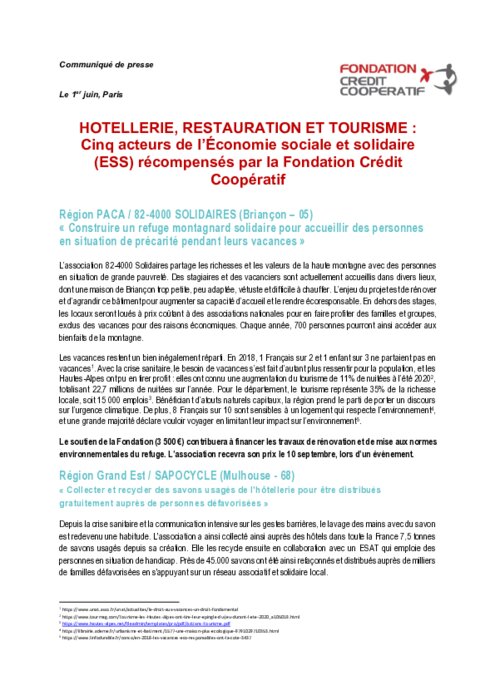 L’édition 2021 des « Prix de l’Inspiration en ESS » de la Fondation Crédit Coopératif récompense 42 structures de l’ESS, acteurs engagés et « inspirés » qui mettent en œuvre des projets utiles en France. Dans le secteur de l’hôtellerie-restauration, 5 structures ont agi en faveur d’une responsabilité sociétale dans le secteur de l’hôtellerie-restauration et du tourisme : pour plus de solidarité, de pratiques responsables et pour limiter leur impact sur l’environnement.