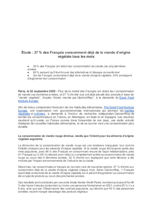 Plus de la moitié des Français ont réduit leur consommation de viande ces dernières années, et 27 % d’entre eux ont déjà adopté des produits à base de “viande végétale”, d’après l’étude menée par OpinionWay*, à la demande du Good Food Institute Europe.