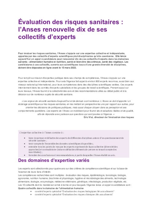 Métiers 12 janvier 2022 - 17:04 Pour évaluer les risques sanitaires, l’Anses s’appuie sur une expertise collective et indépendante, apportée par des collectifs d’experts scientifiques pluridisciplinaires qu’elle coordonne PDF (235 Ko) Télécharger