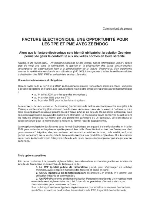 Anticipant les besoins de ses clients, Sages Informatique, expert, depuis plus de vingt ans dans la valorisation, la gestion et la sécurisation des bases documentaires, accompagne les organisations face à la généralisation de la facture électronique. Son expérience comme la variété et le nombre de ses utilisateurs (240 000), lui ont permis d’éditer la meilleure solution à destination des TPE, PME et collectivités locales : Zeendoc.