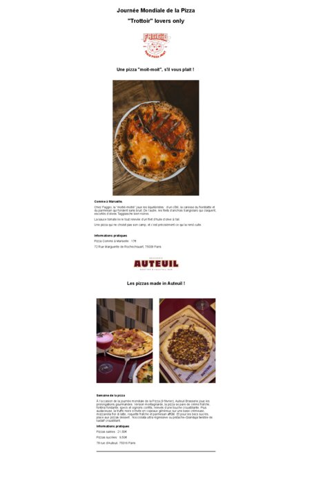 Restauration commerciale 09 février 2026 - 10:46 À l’occasion de la journée mondiale de la Pizza (9 février), Auteuil Brasserie joue les prolongations gourmandes, tandis que chez Faggio, la “moitié-moitié” joue les équilibristes. PDF (5 Mo) Télécharger