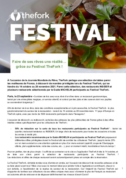 Métiers 23 septembre 2021 - 14:25 À l'occasion de la Journée Mondiale du Rêve (25/09), TheFork partage une sélection de tables parmi les meilleures de France, à découvrir de manière privilégiée lors du Festival TheFork, qui se tiendra du 14 octobre au 28 novembre. PDF (690 Ko) Télécharger
