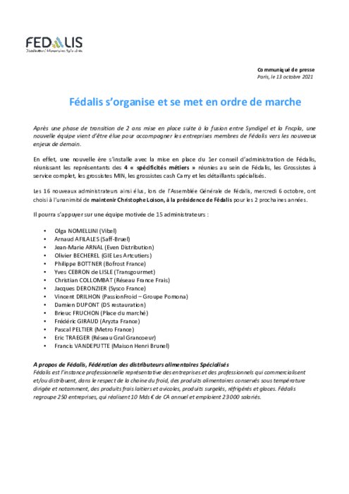 Métiers 13 octobre 2021 - 12:16 Après une phase de transition de 2 ans mise en place suite à la fusion entre Syndigel et la Fncpla, une nouvelle équipe vient d’être élue pour accompagner les entreprises membres de Fédalis vers les nouveaux enjeux de demain. PDF (215 Ko) Télécharger