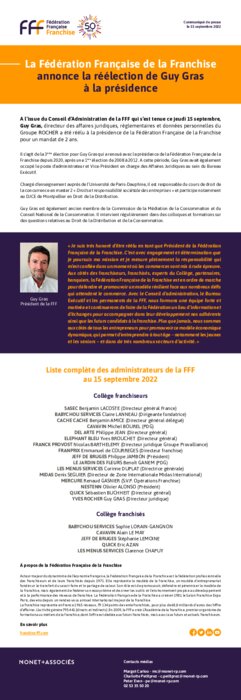 A l’issue du Conseil d’Administration de la FFF qui s’est tenue ce jeudi 15 septembre, Guy Gras, directeur des affaires juridiques, réglementaires et données personnelles du Groupe ROCHER a été réélu à la présidence de la Fédération Française de la Franchise pour un mandat de 2 ans.