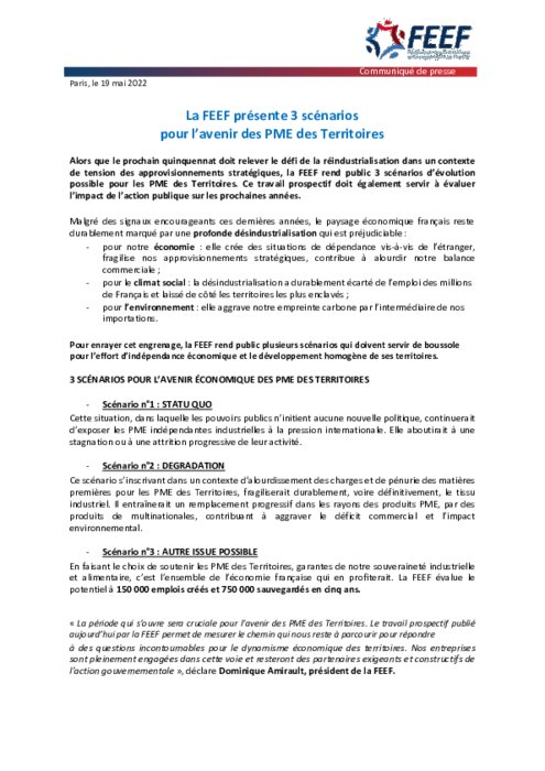 Métiers 19 mai 2022 - 09:57 Alors que le prochain quinquennat doit relever le défi de la réindustrialisation dans un contexte de tension des approvisionnements stratégiques, la FEEF rend public 3 scénarios d’évolution possible pour les PME des Territoires. PDF (256 Ko) Télécharger