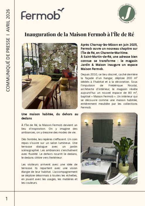 Fournisseurs 20 avril 2026 - 11:11 Fabricant français de mobilier, luminaires et accessoires design, Fermob poursuit le déploiement de ses Maisons et ouvre une nouvelle adresse sur l’Île de Ré, à Saint-Martin-de-Ré, en Charente-Maritime. PDF (2 Mo) Télécharger