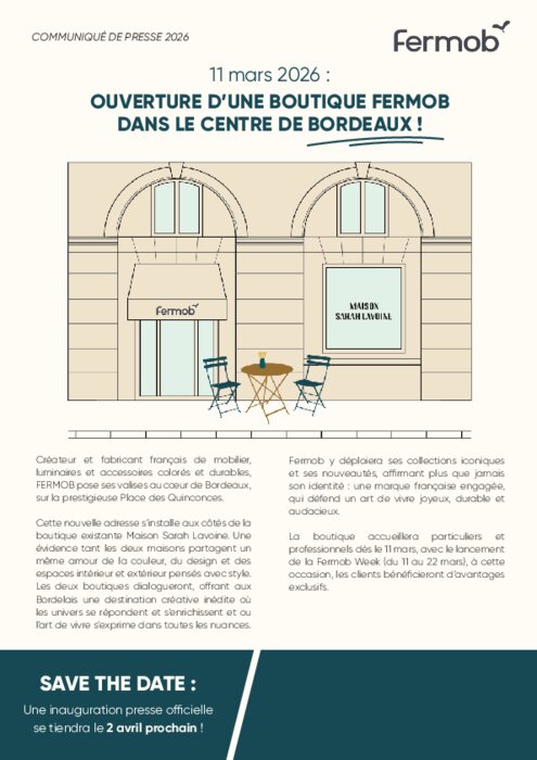 Cette nouvelle adresse, voisine de la boutique Maison Sarah Lavoine, dont Fermob est partenaire, proposera aux Bordelais et professionnels de la région l’ensemble des collections iconiques et des nouveautés de la marque, dans un espace dédié à l’art de vivre intérieur et extérieur.