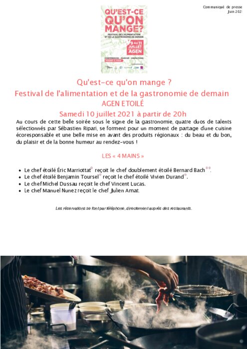 Dans le cadre du Festival de l'alimentation et de la gastronomie de demain qui aura lieu du vendredi 9 juillet au dimanche 11 juillet à Agen, la soirée du samedi 10 juillet fait la part belle aux chefs étoilés de la région, membres du réseau international Chefs4ThePlanet qui se retrouvent autour de plusieurs « 4 mains » d'exception pour ravir les papilles des gourmets et des gourmands...