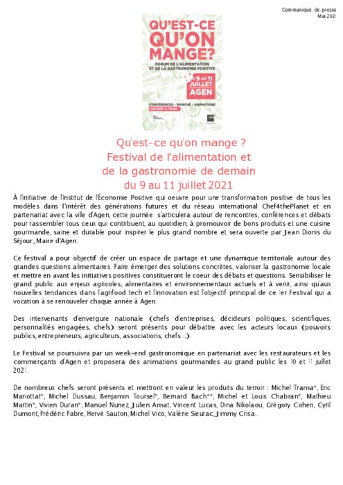 Métiers 31 mai 2021 - 14:06 Sous le haut patronnage du Ministère de l'Agriculture et en présence de son ministre, Julien de Normandie, la première édition du Festival de l'alimentation et de la gastronomie de demain ouvrira ses portes à Agen le vendredi 9 juillet 2021. PDF (1 Mo) Télécharger