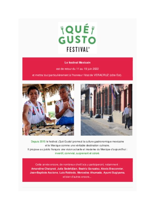 Métiers 31 mars 2022 - 11:12 Depuis 2015 le festival ¡Qué Gusto! promeut la culture gastronomique mexicaine et le Mexique comme une véritable destination culinaire. PDF (266 Ko) Télécharger