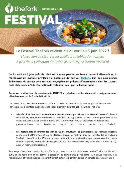 Du 21 avril au 5 juin, près de 1500 restaurants partout en France sont à découvrir ou à redécouvrir de manière privilégiée à l’occasion du Festival TheFork, l’un des plus grands événements du secteur de la restauration, également présent à l’international dans les 12 pays où la plateforme n°1 de réservation de restaurants en ligne en Europe opère.