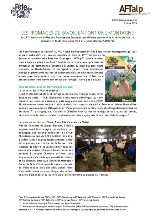 Les huit Fromages de Savoie AOP/IGP sont indéfectiblement liés à leur terroir montagneux, qui leur apporte authenticité et saveurs inimitables. Pour la 19ème édition de sa désormais traditionnelle Fête des Fromages, l’AFTAlp donne rendez-vous à tous les acteurs qui font l’identité du territoire, ainsi qu’à tous les amoureux de gastronomie. Ensemble à Châtel, au pied des plus hauts sommets de Haute-Savoie, ils partagent le temps d’une célébration joyeuse et gourmande tous les fondamentaux de la vie en altitude.
