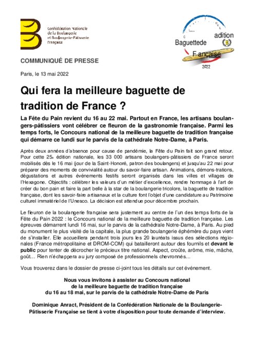 Métiers 13 mai 2022 - 11:05 La Fête du Pain revient du 16 au 22 mai. Partout en France, les artisans boulan gers-pâtissiers vont célébrer ce fleuron de la gastronomie française. PDF (466 Ko) Télécharger