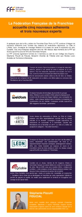 A quelques jours de la 40ème édition de Franchise Expo Paris, la FFF continue d’intégrer de nouveaux adhérents avec l’arrivée des réseaux de restauration Signorizza, La Côte et L’Arête, Leon, l’enseigne de bricolage Weldom et le réseau de vente et réparation de vélo, Cyclable.