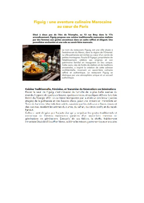 Le "Figuig" est un restaurant marocain à Paris 17 proche de l'Arc de Triomphe. Franchir la porte de Figuig, c’est laisser de côté le tumulte de la plus belle avenue du monde le temps de quelques heures, de quelques notes, de quelques mets concoctés grâce à des gestes ancestraux transmis de génération en génération.
