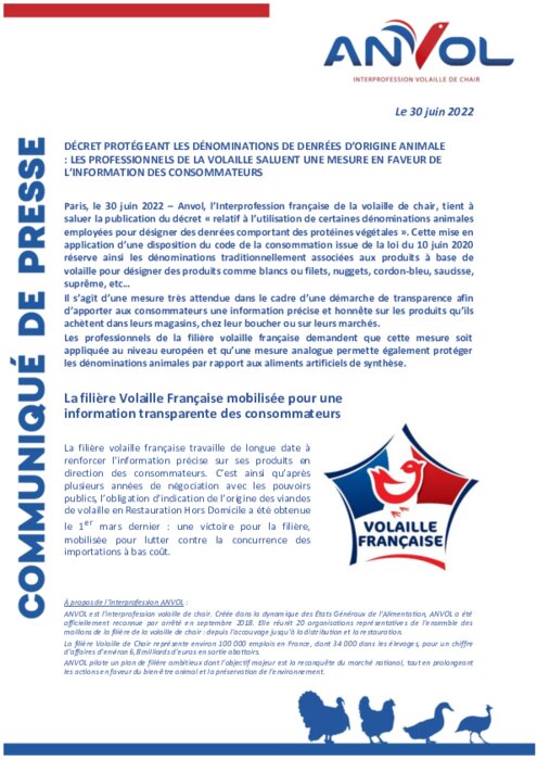Métiers 30 juin 2022 - 18:42 Anvol, l’Interprofession française de la volaille de chair, tient à saluer la publication du décret « relatif à l’utilisation de certaines dénominations animales employées pour désigner des denrées comportant des protéines végétales ». PDF (478 Ko) Télécharger