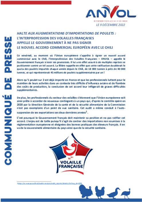 Alors qu’1 poulet sur 2 est déjà importé en France et que les professionnels luttent pour le maintien de leurs activités dans un contexte très difficile d’influenza aviaire et de flambée des coûts de production, la conclusion de cet accord leur infligerait de graves difficultés supplémentaires.