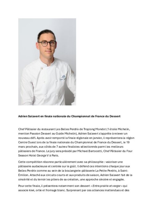 Chef Pâtissier du restaurant Les Belles Perdrix de Troplong Mondot (1 étoile Michelin, mention Passion Dessert au Guide Michelin), Adrien Salavert s'apprête à relever un nouveau défi. Après avoir remporté la finale régionale en janvier, il représentera la région Centre Ouest lors de la finale nationale du Championnat de France du Dessert, le 19 mars prochain, aux côtés de 7 autres finalistes sélectionnés parmi les meilleurs pâtissiers de France. Le jury sera présidé par Michael Bartocetti, Chef Pâtissier du Four Season Hotel George V à Paris.