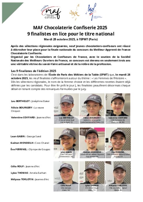 Métiers 22 octobre 2025 - 08:03 Après des sélections régionales exigeantes, neuf jeunes chocolatiers-confiseurs ont réussi à décrocher leur place pour la finale nationale du concours du Meilleur Apprenti de France Chocolaterie Confiserie. PDF (2 Mo) Télécharger