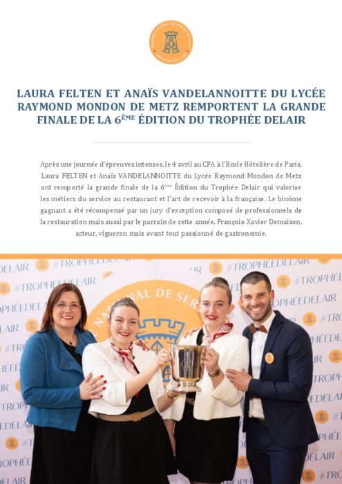 Après une journée d’épreuves intenses, le 4 avril au CFA à l’Ecole Hôtelière de Paris, Laura Felten et Anaïs Vandelannoitte du Lycée Raymond Mondon de Metz ont remporté la grande finale de la 6ème Édition du Trophée Delair qui valorise les métiers du service au restaurant et l’art de recevoir à la française. Le binôme gagnant a été récompensé par un jury d’exception composé de professionnels de la restauration mais aussi par le parrain de cette année, François-Xavier Demaison, acteur, vigneron mais avant tout passionné de gastronomie.
