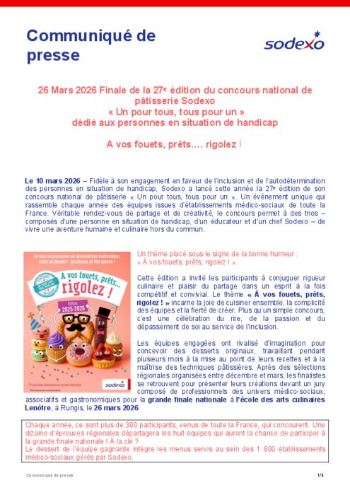 Fidèle à son engagement en faveur de l’inclusion et de l’autodétermination des personnes en situation de handicap, Sodexo a lancé cette année la 27ᵉ édition de son concours national de pâtisserie « Un pour tous, tous pour un ». Un événement unique qui rassemble chaque année des équipes issues d’établissements médico-sociaux de toute la France. Véritable rendez-vous de partage et de créativité, le concours permet à des trios –composés d’une personne en situation de handicap, d’un éducateur et d’un chef Sodexo – de vivre une aventure humaine et culinaire hors du commun.
