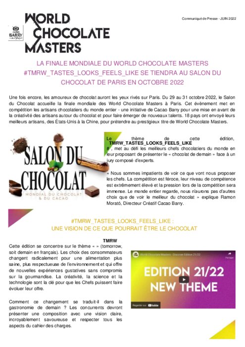 Métiers 01 juin 2022 - 10:44 Une fois encore, les amoureux de chocolat auront les yeux rivés sur Paris. Du 29 au 31 octobre 2022, le Salon du Chocolat accueille la finale mondiale des World Chocolate Masters à Paris. PDF (428 Ko) Télécharger
