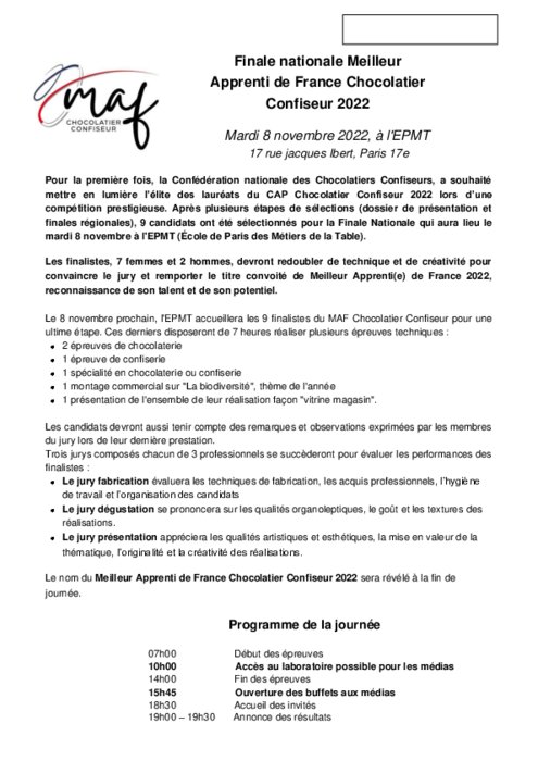 Métiers 04 novembre 2022 - 08:21 Pour la première fois, la Confédération nationale des Chocolatiers Confiseurs, a souhaité mettre en lumière l’élite des lauréats du CAP Chocolatier Confiseur 2022 lors d’une compétition prestigieuse. PDF (261 Ko) Télécharger