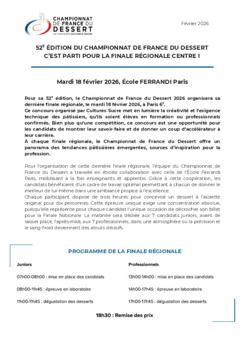 Pour sa 52e édition, le Championnat de France du Dessert 2026 organisera sa dernière finale régionale, le mardi 18 février 2026, à Paris 6e. Ce concours organisé par Cultures Sucre met en lumière la créativité et l’exigence technique des pâtissiers, qu’ils soient élèves en formation ou professionnels confirmés. Bien plus qu’une compétition, ce concours est une opportunité pour leur carrière. À chaque finale régionale, le Championnat de France du Dessert offre un panorama des tendances pâtissières émergentes, sources d’inspiration pour la profession.