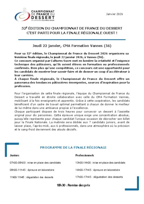 Pour sa 52e édition, le Championnat de France du Dessert 2026 organisera sa troisième finale régionale, le jeudi 22 janvier, à Vannes (56). Ce concours organisé par Cultures Sucre met en lumière la créativité et l’exigence technique des pâtissiers, qu’ils soient élèves en formation ou professionnels confirmés. Bien plus qu’une compétition, ce concours est une opportunité pour les candidats de montrer leur savoir-faire et de donner un coup d’accélérateur à leur carrière.