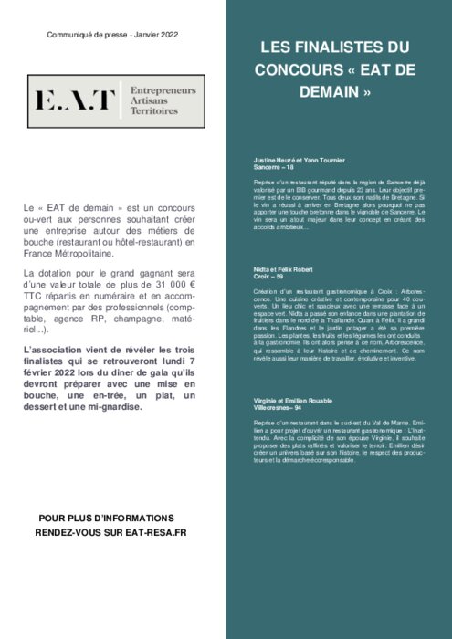 Le « EAT de demain » est un concours ouvert aux personnes souhaitant créer une entreprise autour des métiers de bouche (restaurant ou hôtel-restaurant) en France Métropolitaine.