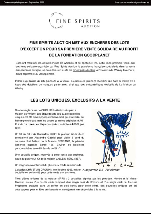 Espérant mobiliser les collectionneurs de whiskies et de spiritueux fins, cette toute première vente aux enchères solidaire organisée par Fine Spirits Auction, la plateforme française spécialisée dans la vente aux enchères en ligne, se déroulera sur le site de Fine Spirits Auction, à l’occasion du Whisky Live Paris, du 24 septembre au 30 septembre.