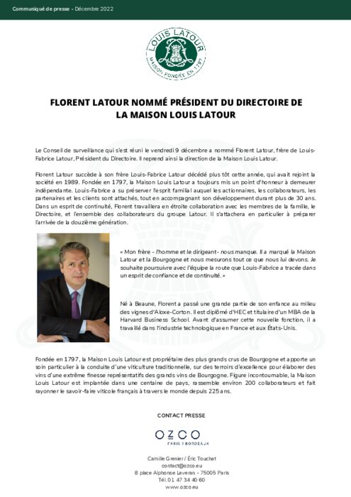 Le Conseil de surveillance qui s’est réuni le vendredi 9 décembre a nommé Florent Latour, frère de LouisFabrice Latour, Président du Directoire. Il reprend ainsi la direction de la Maison Louis Latour.