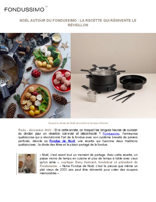 Et si on troquait les longues heures de cuisson du dindon pour un réveillon convivial et décontracté ? Fondussimo, l'entreprise québécoise qui a séduit 160 000 foyers avec son système breveté de paniers perforés, dévoile sa Fondue de Noël : boulettes de dindon au cœur de fromage fondant, bouillon parfumé au vin blanc et chutney aux canneberges maison.