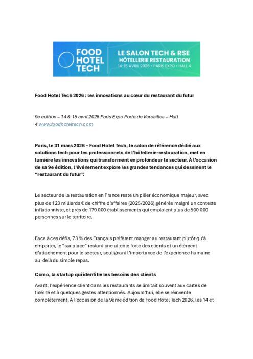 Food Hotel Tech, le salon de référence dédié aux solutions tech pour les professionnels de l’hôtellerie-restauration, met en lumière les innovations qui transforment en profondeur le secteur. À l’occasion de sa 9e édition, l’événement explore les grandes tendances qui dessinent le “restaurant du futur”.