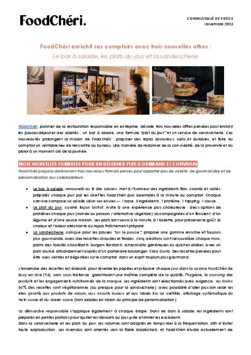 FoodChéri, pionnier de la restauration responsable en entreprise, dévoile trois nouvelles offres pensées pour enrichir les pauses-déjeuner des salariés : un bar à salade, une formule “plat du jour” et un service de sandwicherie. Ces nouveautés prolongent la mission de FoodChéri : proposer des repas savoureux, sains et durables, et faire du comptoir un véritable lieu de rencontre au bureau. Une manière de redonner de la convivialité, de la proximité et du plaisir à un moment clé de la journée.