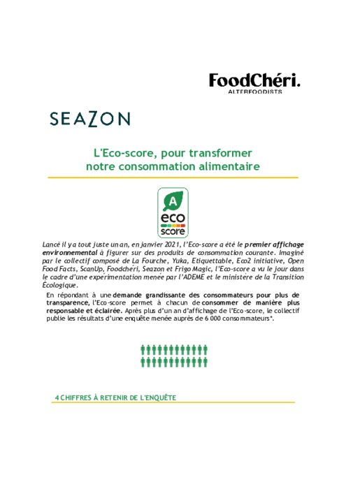 Métiers 16 février 2022 - 14:31 Lancé il y a tout juste un an, en janvier 2021, l’Eco-score a été le premier affichage environnemental à figurer sur des produits de consommation courante. PDF (242 Ko) Télécharger