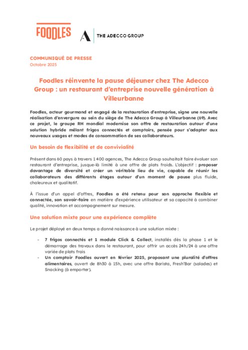 Foodles, acteur gourmand et engagé de la restauration d’entreprise, signe une nouvelle réalisation d’envergure au sein du siège de The Adecco Group à Villeurbanne (69). Avec ce projet, le groupe RH mondial modernise son offre de restauration autour d’une solution hybride mêlant frigos connectés et comptoirs, pensée pour s’adapter aux nouveaux usages et modes de consommation de ses collaborateurs.