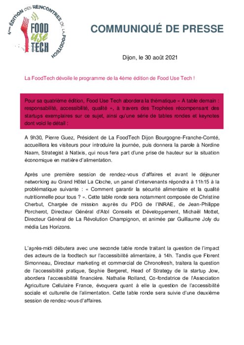 Métiers 30 août 2021 - 11:59 Pour sa quatrième édition, Food Use Tech abordera la thématique « A table demain : responsabilité, accessibilité, qualité », à travers des Trophées récompensant des startups exemplaires sur ce sujet, ainsi qu’une série de tables rondes et keynotes. PDF (111 Ko) Télécharger