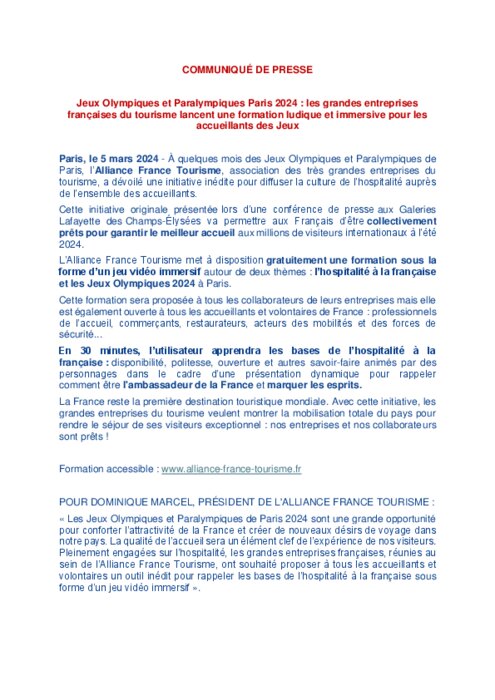 À quelques mois des Jeux Olympiques et Paralympiques de Paris, l’Alliance France Tourisme, association des très grandes entreprises du tourisme, a dévoilé une initiative inédite pour diffuser la culture de l’hospitalité auprès de l’ensemble des accueillants. Cette initiative originale présentée lors d’une conférence de presse aux Galeries Lafayette des Champs-Élysées va permettre aux Français d’être collectivement prêts pour garantir le meilleur accueil aux millions de visiteurs internationaux à l’été 2024.