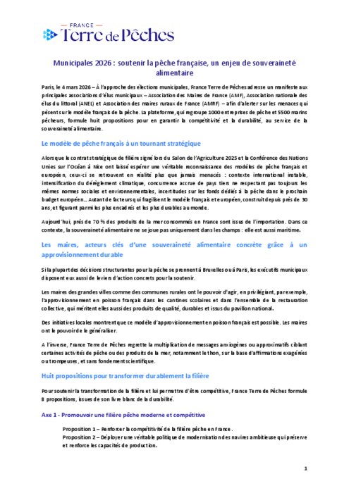 La semaine dernière, France Terre de Pêches a publié un manifeste adressé aux principales associations d’élus locaux (AMF, ANEL, AMRF). Ce manifeste rappelle que les exécutifs municipaux disposent de leviers d’action concrets pour soutenir les pêcheurs français, même si leur commune ne se situe pas sur un littoral.