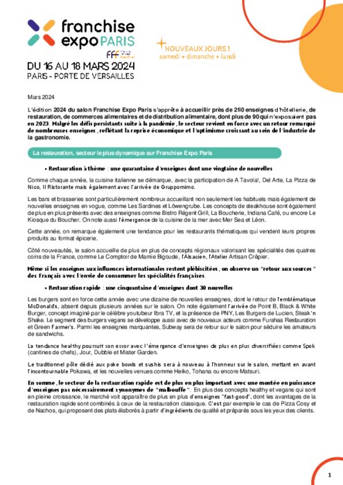 L’édition 2024 du salon Franchise Expo Paris s’apprête à accueillir près de 210 enseignes d’hôtellerie, de restauration, de commerces alimentaires et de distribution alimentaire, dont plus de 90 qui n’exposaient pas en 2023. Malgré les défis persistants suite à la pandémie, le secteur revient en force avec un retour remarqué de nombreuses enseignes, reflétant la reprise économique et l’optimisme croissant au sein de l’industrie de la gastronomie.