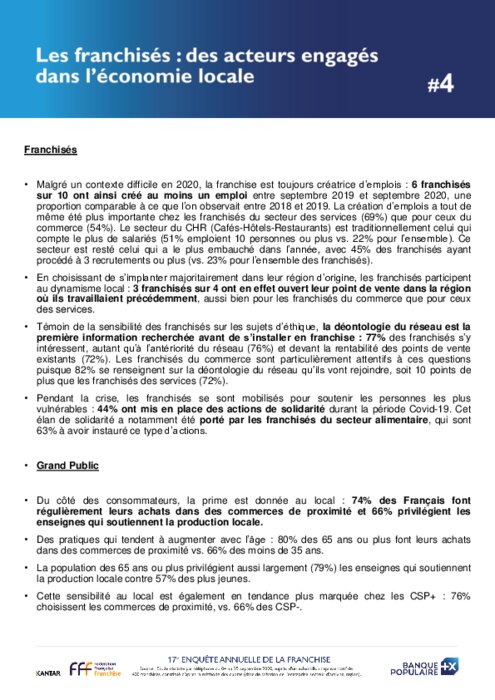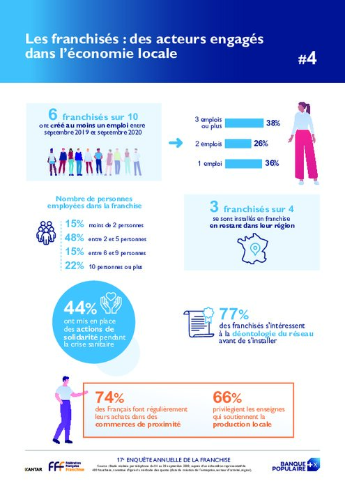 Malgré un contexte difficile en 2020, la franchise est toujours créatrice d’emplois : 6 franchisés sur 10 ont ainsi créé au moins un emploi entre septembre 2019 et septembre 2020, une proportion comparable à ce que l’on observait entre 2018 et 2019. Le secteur du CHR (Cafés-Hôtels-Restaurants) est traditionnellement celui qui compte le plus de salariés (51% emploient 10 personnes ou plus vs. 22% pour l’ensemble). Ce