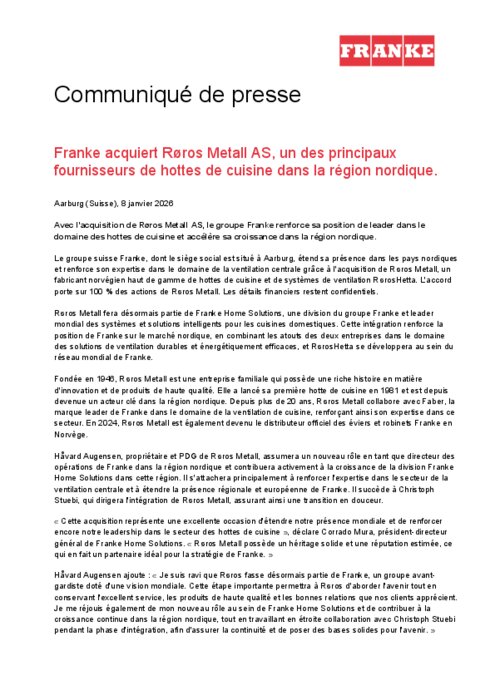 Le groupe suisse Franke, dont le siège social est situé à Aarburg, étend sa présence dans les pays nordiques et renforce son expertise dans le domaine de la ventilation centrale grâce à l'acquisition de Røros Metall, un fabricant norvégien haut de gamme de hottes de cuisine et de systèmes de ventilation RørosHetta.