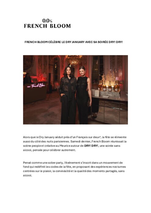 Alors que le Dry January séduit près d’un Français sur deux, la fête se réinvente aussi du côté des nuits parisiennes. Samedi dernier, French Bloom réunissait la scène people et créative au Meurice autour de Dry! Dry!, une soirée sans alcool, pensée pour célébrer autrement.